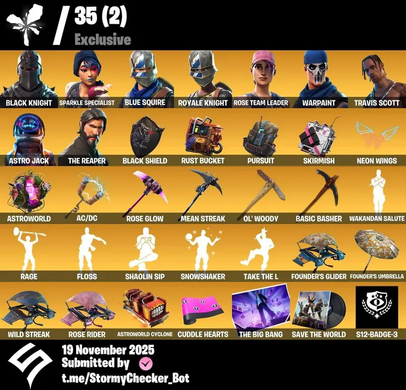 [PC/XBL/PSN] | 142 Skins | OG STW | Black Knight | Sparkle Specialist | Blue Squire | Royale Knight | Rose Team Leader | Warpaint | Travis Scott | Astro Jack | AC/DC | Rose Glow | Mean Streak | S12-Badge-3 | 200 VB