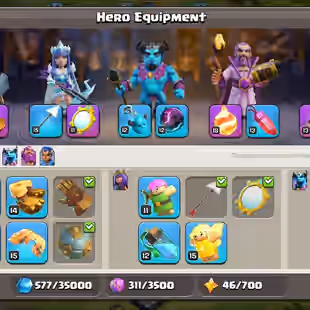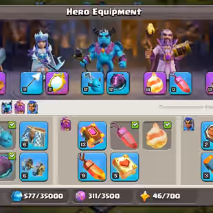 AA210-|| TH13 Close To Max || Defense Fully Maxed || Hero-53-58-32-43-15 || 12X Epic Equipment Close Max || 3000 Gems ||