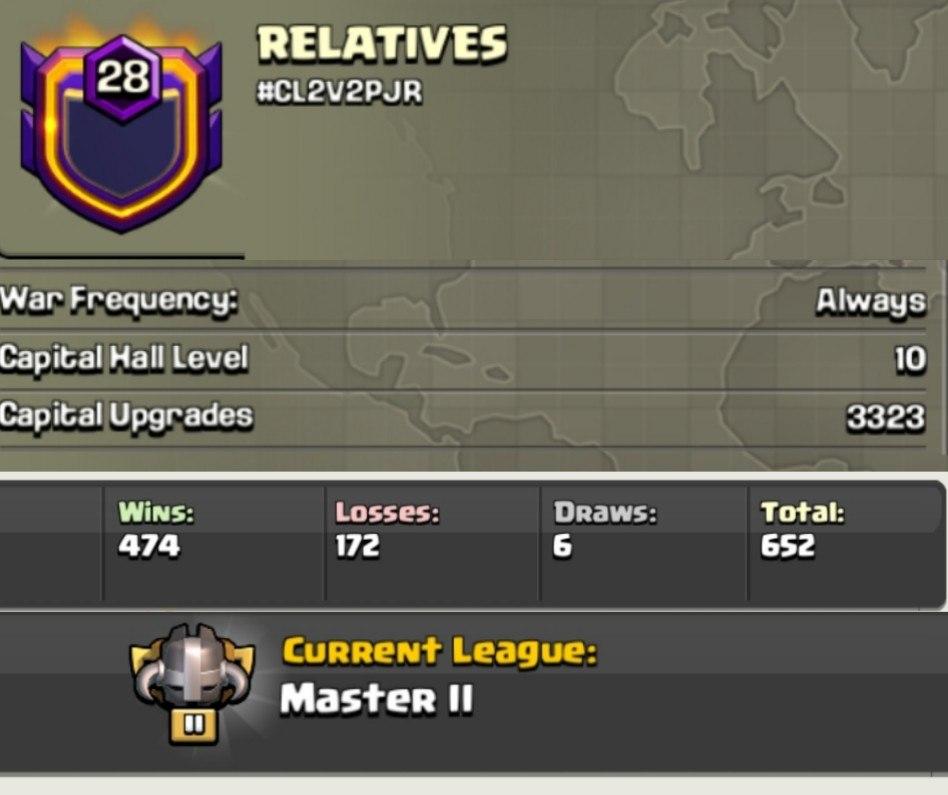 BEST NAME 💎 NAME: RELATIVES 💎LEVEL: 28 [] CAPITAL HALL: 10 [] WAR LOG: 474-172 [] CWL LEAGUE: MASTER II [] AVAILAB