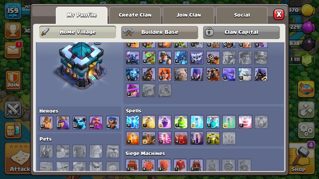 COC ACCOUNT |Safe | CHEAP |TH13 Nearly MAX | Lvl 159 | 1111 GEM | Heros 57-62-42-44-16 | INSTANT DELIVERY