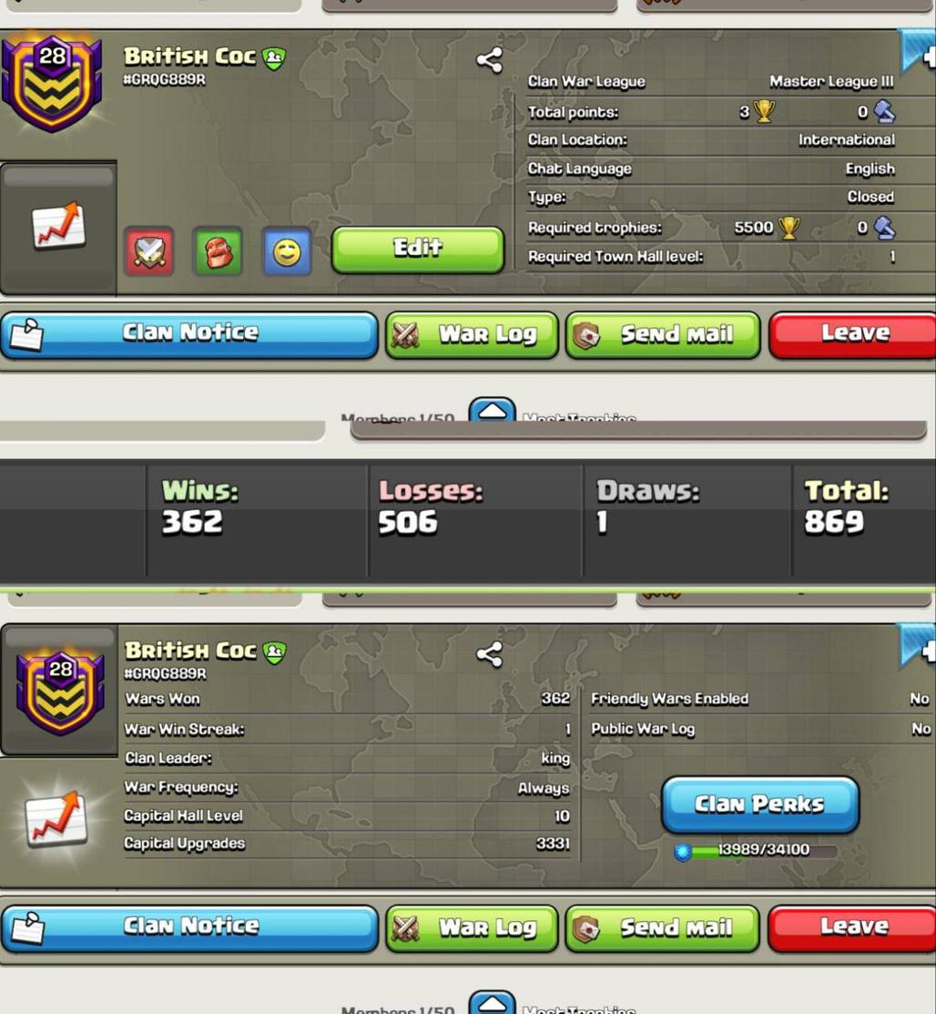BRITISH COC [] LEVEL 28 [] CAPITAL 10 [] 362/506 WAR LOG [] MASTER LEAGUE III