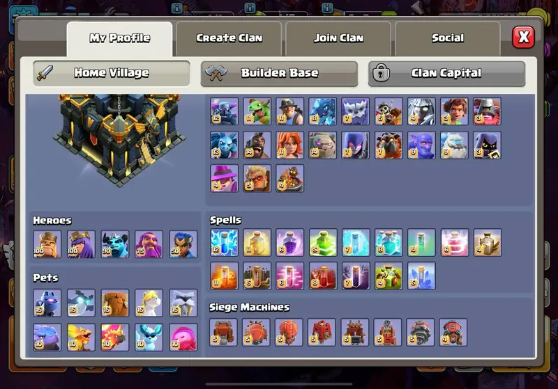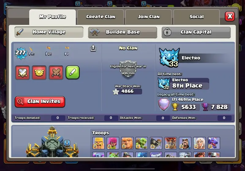 FULL MAX PROFILE - 23 EQUIPMENT MAX - TOWNHALL 17 - 277 XP - 4866 WWS - CUPS - 654 MEDAL - COSMIC SCENERY - BH 10 MAX - 1343 GEMS - AVAILABLE