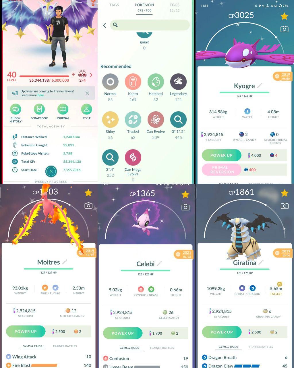 LEVEL 40 STACKED ACCOUNT I YEAE 2019 ( 10 SHINY LEGENDARY ALL TRADABLE) I 121 LEGENDARY I SHINY KYOGRA, CELEBI, MOLTRAS, GIRATINA I 2016 CREATED I INSTANT ACCESS