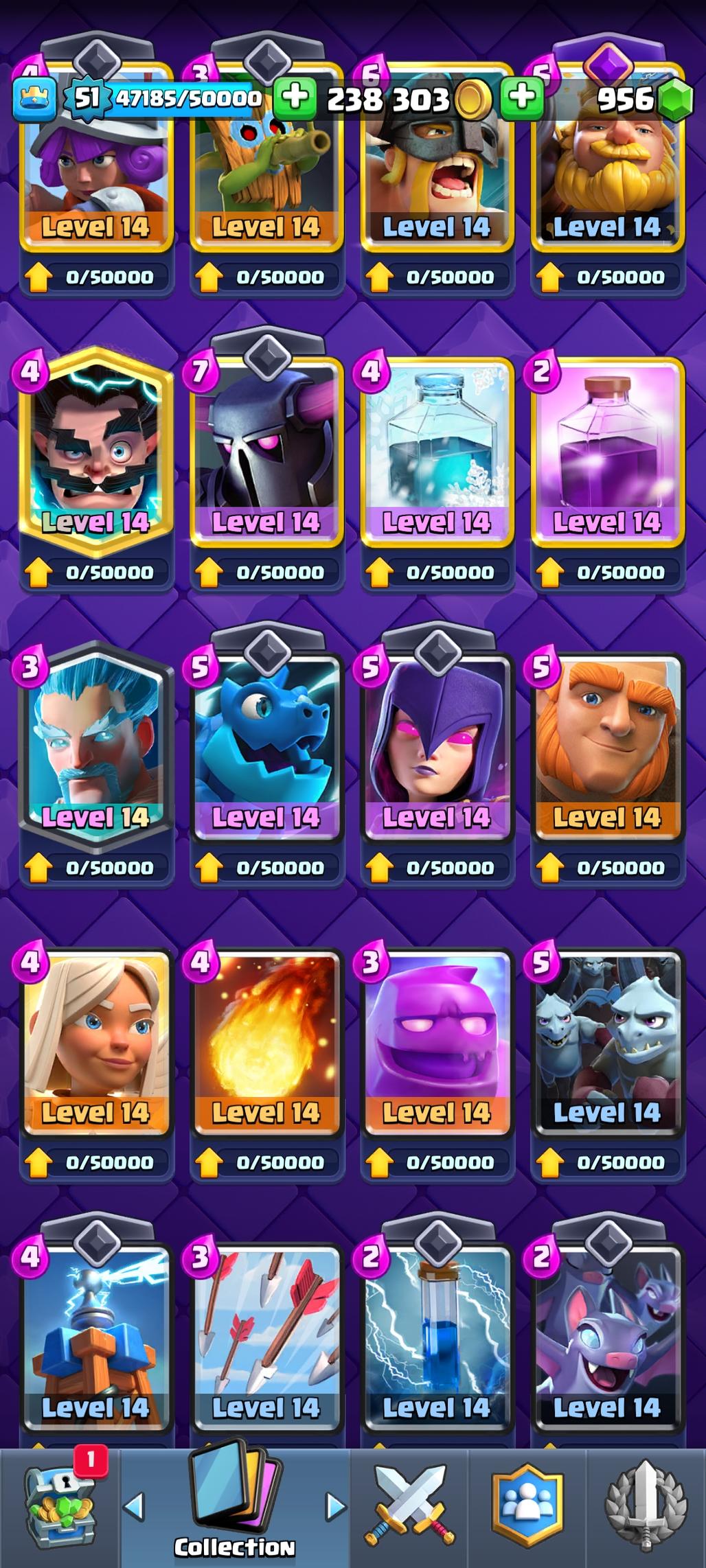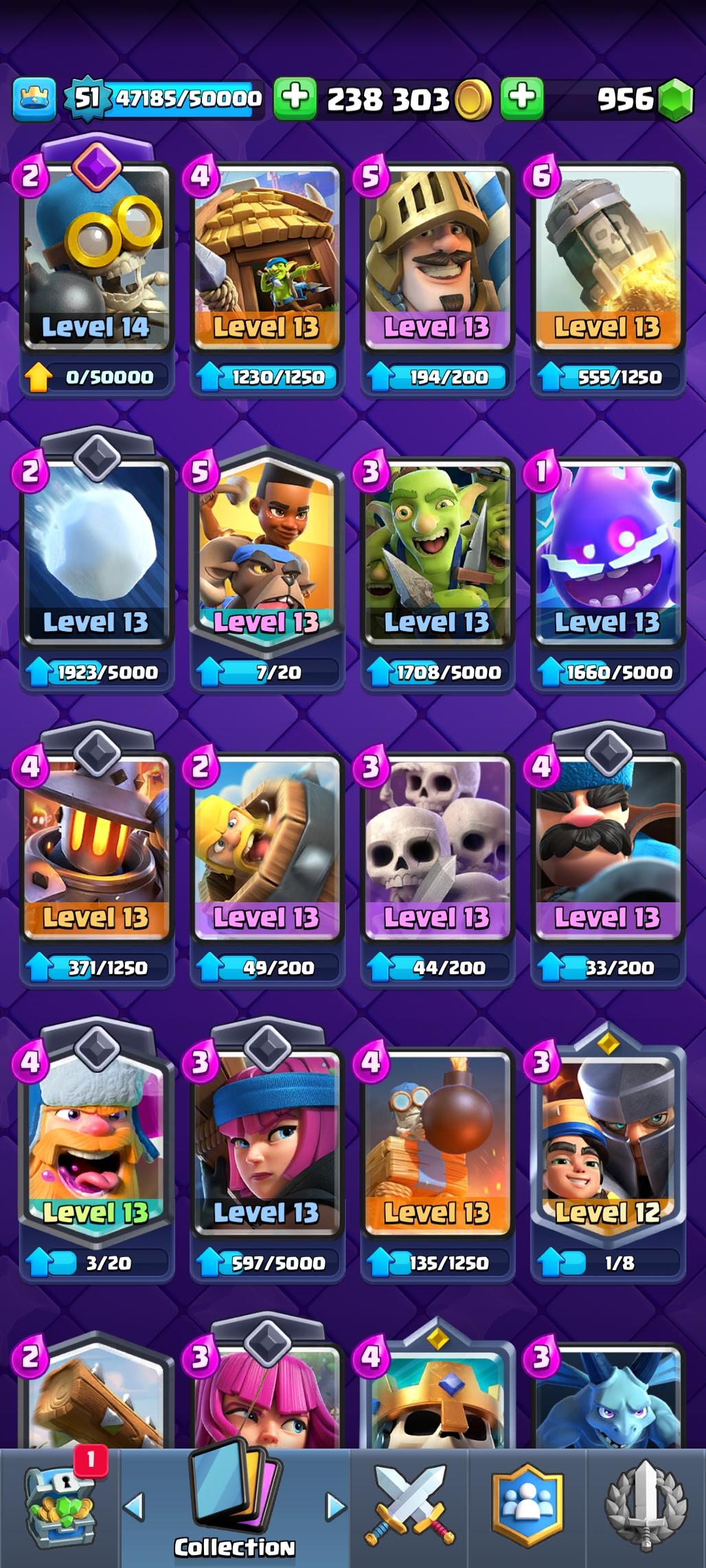 Level 51 | Level 15 card 2 | Level 14 card 32 | Level 13 card 14 | gems 956 | CN 500 | code 12