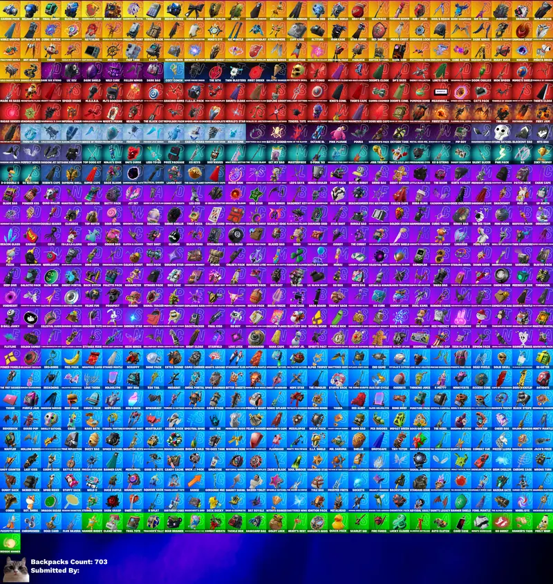 🎒 Backpacks: 703 — A comprehensive assortment of backpacks essential for any Fortnite adventure. 🎒