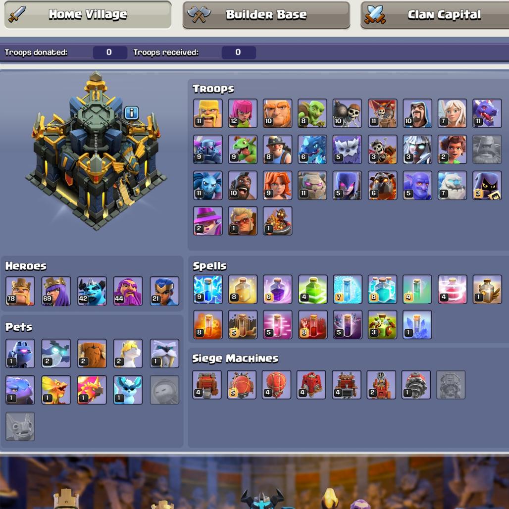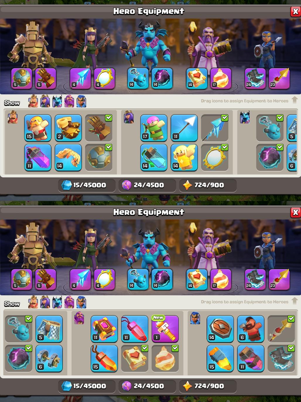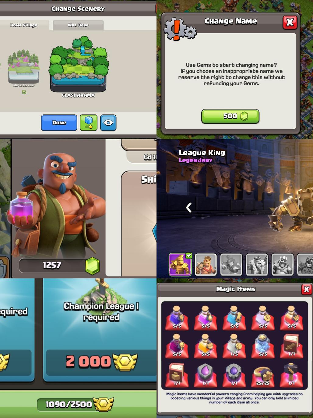 TH17 || KING LEAGUE SKIN || 8 EPIC EQUIPMENT || K-78 AQ-69 MP-42 GW-44 RC-21 || NAMECHANGE AVALIABLE || 1250 GEMS || MAGIC ITEMS || 1090 CWL MEDALS
